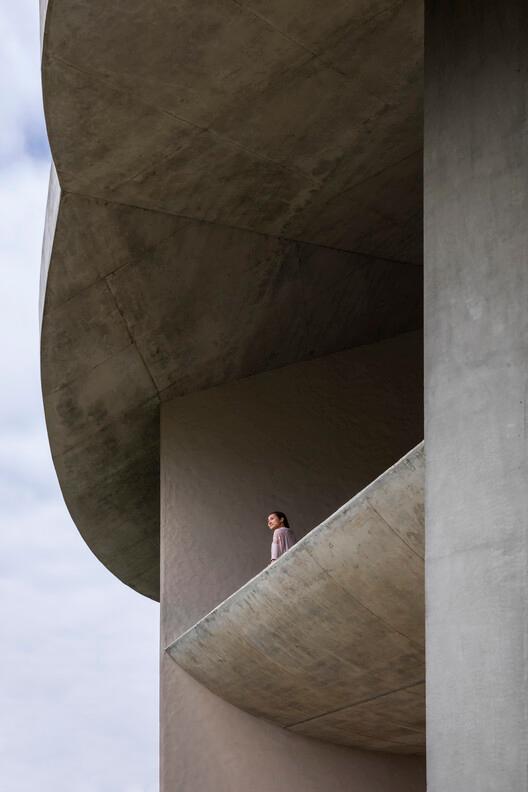 建筑巨大的錐形屋頂形似一種名叫“nón lá”的越南傳統的農民帽子,將陰影投射在整個建筑上。雙層屋頂之間的通風腔可以抵御陽光,起到了隔熱的作用,而深屋檐使中央空間的窗戶即使在下雨時也能保持打開的狀態。建筑的主要功能被安置在一個懸浮的板塊上,使空間免受地面濕度的影響。