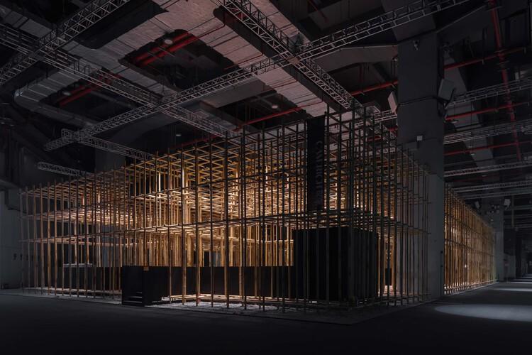 竹子作為一種儲量豐富、生長迅速的可再生材料,自古以來在世界許多地區都被視為絕佳的建筑材料之一。天然的竹子表皮散布斑點與紋路,截面呈橢圓狀,竹節有大有小,透露著自然生長的痕跡。而現代技術又拓寬了竹子在建筑領域的應用范圍。如恩從竹子中汲取靈感,將展陳空間打造成一座竹林。 一千多個竹結構規律地排列成矩陣,抽象而理性,猶如縝密的數學演算,區隔了內外空間。觀者進入竹林,步道所及之處,層層疊疊,密實交錯。